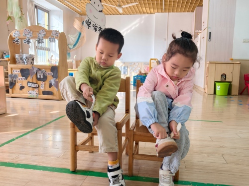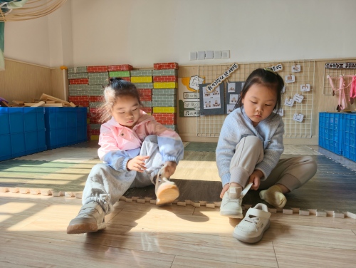 孩子们把鞋子摆在地上,像玩游戏一样观察“小鞋子”是“头碰头”还是“把头扭”。慢慢地,“穿反鞋”的次数越来越少,他们在分辨左右的过程中,也明白了了“尝试”与“探索”的意义。