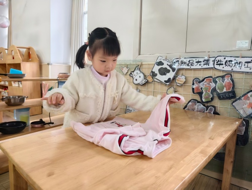 虽然刚上学的时候我们还不会穿脱和整理衣物,但是在老师的帮助下,我们一点一滴的进步,学会了叠衣服,我们的变化可真大啊!