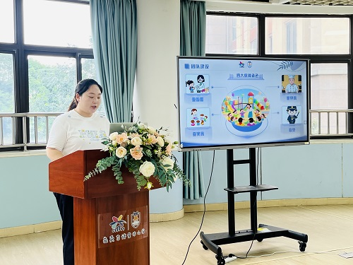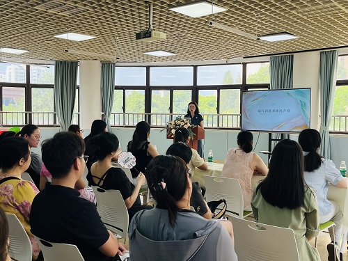 随后,业务园长王祯就家长们最关心的幼儿在园一日作息、课程体系及家园共育工作进行了详尽的介绍。王园长以《3-6岁儿童学习与发展指南》为指导,向家长解读幼儿从入园到离园各环节的科学安排,介绍课程如何通过游戏化、生活化的方式促进幼儿在五大领域的全面发展,让家长了解到幼儿园教育的专业与温度,从而建立起对园所认同与信任。最后,她强调了家园合作的重要性,呼吁家长与幼儿园携手并肩,形成教育合力,同心同行共育花开。